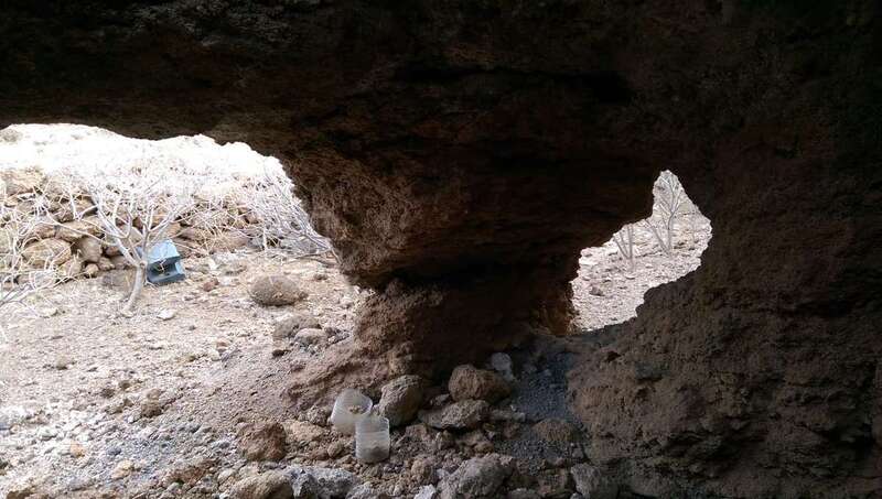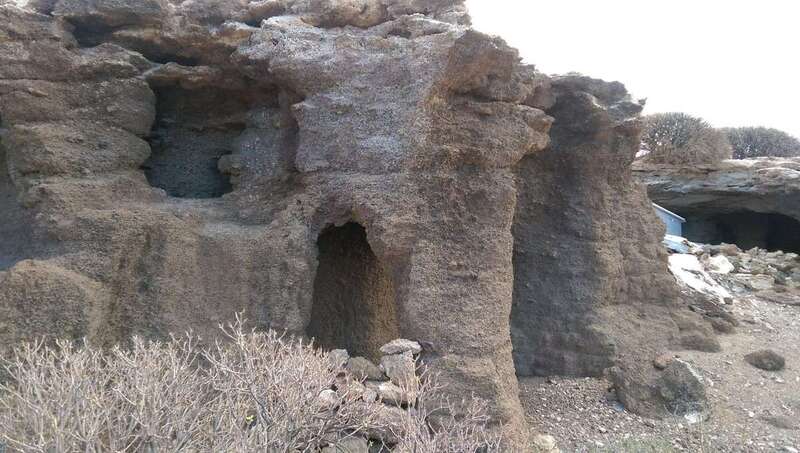 Hemos realizado un visionado de trescientos sesenta grados. Estoy satisfecho. Ahora deambularé por el tabaibal, dejándome llevar por las laderas no visitadas. Deseo recorrerlas todas y comenzaré por la cara sur, justo donde acaba o comienza, la trinchera antes señalada. Terminada la trinchera, un enorme vacío. Orientada al océano, esta esplanada es el resultado de la sistemática extracción de picón de esta parte de la montaña. Si aquí termina la trinchera, ¿existió tal vez una batería de costa en esta zona? No sería de extrañar, teniendo en cuenta el aprovechamiento militar que se hizo en su día de la mayoría de los conos volcánicos de este sector de costa. En el interior de este espacio excavado, observamos la forma de cuatro cuevas. Una pequeña a la derecha y tres juntas y más grandes al fondo. Una ventana comunica dos de ellas. Al parecer ni son cuevas aborígenes ni han sido desarrolladas por la naturaleza durante cientos o miles de años, son cuevas producto de un proceso erosivo reciente tras el expolio de sus cenizas volcánicas. A nuestra vista, los caprichos de la naturaleza y la erosión diferencial han dejado hermosas formas en el paisaje alterado. Las cenizas volcánicas presentan colores negruzcos, rojizos, amarillentos, blanquecinos, distribuyéndose en capas o vetas, un verdadero cuadro impresionista.