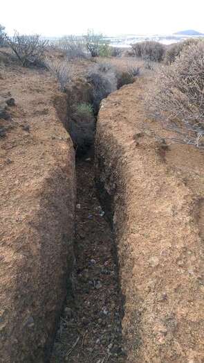 Planes y estrategias militares han llevado a horadar el suelo con una larga y profunda zanja, dejando luego herida la montaña y añadiéndole un potencial riesgo de caída, posibilidad sin señalizar en modo alguno, significando un peligro potencial para quienes la transitan.