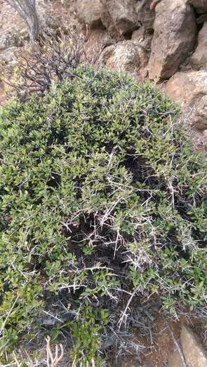 En la cara este, bajo la antigua piconera, observo algunos ejemplares de cornical y azaigo de risco. No son muchos. Están al abrigo de un roquete que se extiende una decena de metros y que se trata, sin lugar a dudas, de una lengua de lava que se quedó ahí, en superficie, ahora resquebrajada por los cambios térmicos y colonizados sus bordes por el tabaibal. Es al pie de este roquedo donde observo lo que podría ser un acebuche achaparrado, con sus hojas verdes brillantes y duras, sus ramas recias y de color claro. Una vez más necesito la confirmación de un botánico, pero el placer del encuentro es mayúsculo.