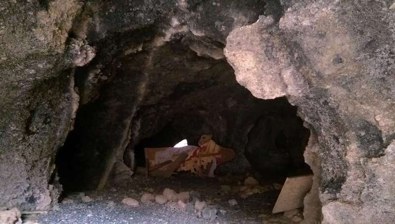 Salimos de esta cueva y seguimos con nuestro descenso, apenas una decena de metros. Observaremos en el camino un lucernario que, si nos aproximamos, permite, agachándose, el paso de una persona. Si lo queremos observar con mayor detenimiento, debemos ser muy prudentes y, gateando, acercarnos a sabiendas de que la luz que procura llega a una de las cuevas que se encuentran en un nivel inferior y cuya distancia al suelo de la misma es considerable. Seguimos el descenso para acceder a la gran cueva. Es en ella donde se desarrolla el Auto de Navidad que ahora, iniciado el verano, muestra los restos de las figuras recortadas de un Belén de tamaño natural, rotas e inservibles pero que nadie ha reparado en retirarlas de la cueva, una vez convertidas en basura. Lo mismo sucede con una cruz de gran tamaño que, abandonada a un lado, justo donde se encuentran las pocetas verticales de factura aborigen, se encuentra sin una parte del travesaño horizontal -el patibulum romano-, cubierta por los excrementos de las palomas bravías.