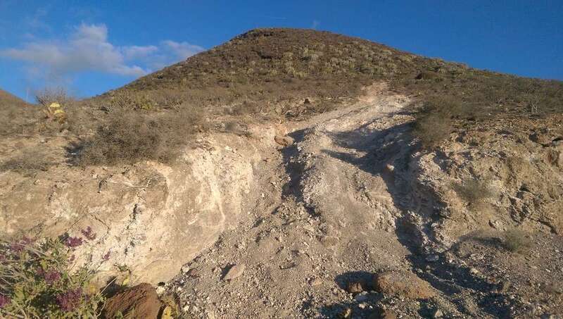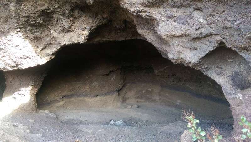 A la dificultad asociada al descenso desde la cima por esta ladera, pues la pendiente supera en algunas zonas los cuarenta y cinco grados, se le une una tupida y enmarañada red de tuneras indias. No en vano, a punto de coronar esta ladera, la tunera india presenta su mayor densidad en la montaña. Estas razones aconsejan buscar el acceso a las cuevas partiendo de la base de la montaña, bien por la cara sur, más complejo porque a la acusada pendiente que encontramos se le une el destrepe inicial para salvar el tajo vertical que se le dio a la montaña y que en algunos puntos este tajo presenta alturas cercanas a los tres metros de verticalidad, en aras de conseguir la horizontalidad necesaria para trazar la carretera de acceso al interior del valle y el cortijo de El Gamonal, bien por la cara este -estimo que la más cómoda y segura-, ascendiendo lateralmente hasta buscar su ubicación. La inexistencia de una senda clara desaconseja la búsqueda y el acceso a la cueva a quienes tengan vértigo o no estén acostumbrados a caminar por montañas de fuerte pendiente. La visita quedará supeditada al interés que usted tenga por abordarla. La responsabilidad asociada a tal decisión siempre la tendrá usted, estimado lector. Permítanme pues que, al igual que les orienté en montaña Las Palmas sobre la vertiente sur del cono, describirles las cuevas en lugar de animarlos en su búsqueda. Nuestro periplo discurre entre una vegetación de veroles, cardones, tabaibas amargas, aulagas, bejeques (Aeonium percarneum), azaigos de risco, balos, cornicales y una población muy importante de tunera india.