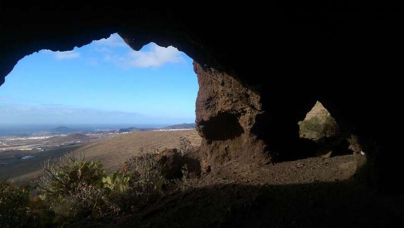 Desde la entrada de la cueva más grande, protegida de las inclemencias del viento, el agua y los fríos del norte por un amplio solapón a modo de visera, observo la cueva de los Pilares en la montaña de Cuatro Puertas, Gando y el roque del mismo nombre, el poblado indígena de Tufia y sus cuevas desafortunadamente urbanizadas, el yacimiento arqueológico de la montaña de Malfú, la montaña de Arinaga…