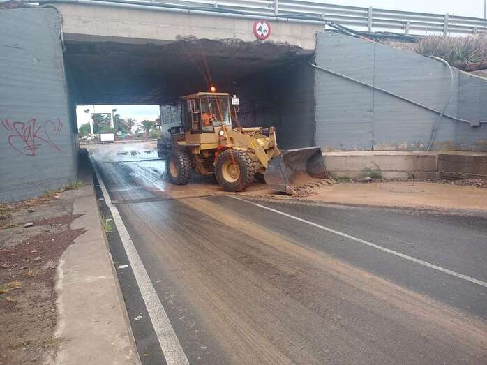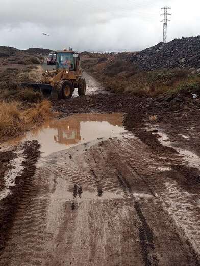 El Ayuntamiento de Telde activó después de la tromba de agua caída en la parte sur del municipio un dispositivo con maquinaria pesada para limpiar carreteras especialmente en la zona de Tufia, El Goro, Ojos de Garza y zona industrial de El Goro.