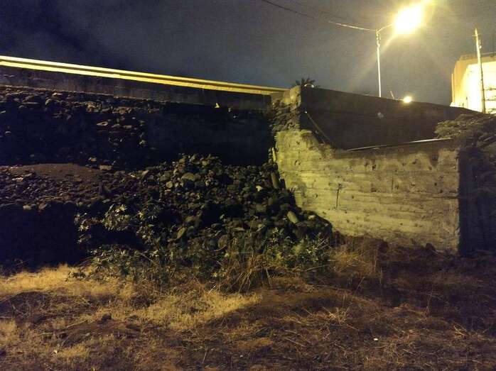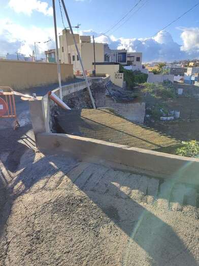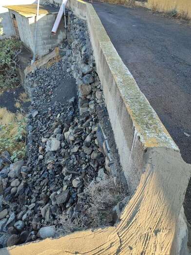 La lluvia caída este lunes en Telde provocó el desprendimiento de la base de un muro en la calle de Diana, en el sector poblacional de Caserones Bajos, según informan vecinos del lugar.