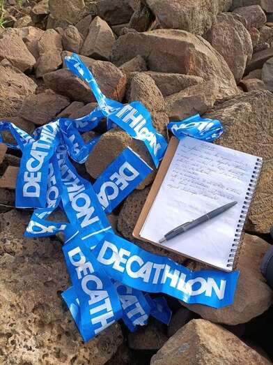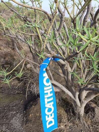 Yo sólo señalaré lo que veo y para dar fe de ello lo expongo en las fotos adjuntas a este artículo. Lo cierto es que antes de subir a la cima de la montaña me dejé llevar por ese pequeño sendero que bordea la montaña y desciende hasta el barranco en cuestión. La razón no fue botánica ni faunística sino la retirada de decenas de señales de plástico, cintas publicitarias que, sujetas todas ellas a la vegetación autóctona de la zona -en su mayoría tabaibas y veroles-, estaban allí, esperando ¿qué?