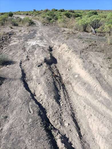 La llegada a la cima me depara una triste sorpresa. La escasa pendiente y facilidad de acceso ha propiciado el uso y abuso de las motos de montaña en este cono. Adjunto foto con el destrozo del camino efectuado por este tipo de vehículos, sobre todo en su caras este y oeste.
