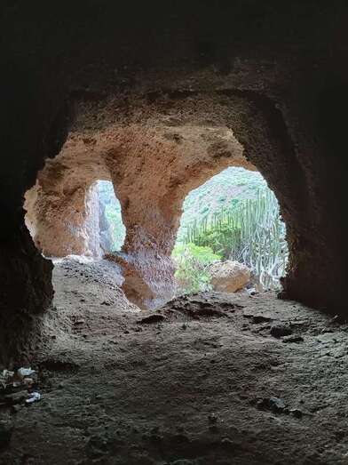 Hay dos habitáculos más en el camino, una gatera permite el paso, arrastrándose, y se intuye el lugar donde poner el pie para subir a la cueva superior. Este nivel es espectacular. De hecho, tras el pequeño ascenso, me siento de espaldas a la cueva para observar el hermoso y limpio paisaje que se abre ante mí. Los conos volcánicos de montaña del Gallego, montaña Herrero y la parte más alta de la montaña del Melosal cierran cualquier otro horizonte que no sea el propio barranco. Un frente de barranco orientado a la umbría donde la vegetación natural ha colonizado al completo las antiguas cadenas de cultivo convirtiéndolas en un interesante tabaibal. En ese preciso instante de placidez y plenitud, con el horizonte visual convertido en edén, la vista se dirige al cielo pues mis oídos han captado los chillidos, agudos y espaciados, de tres aguilillas que, majestuosas, se elevan siguiendo las térmicas. Sean reclamos o gritos de alerta, lo cierto es que las aguilillas despiertan mi atención y podría pasar mucho tiempo observando sus siluetas, siguiendo sus círculos concéntricos, hasta perderse en las alturas celestes. Pero estoy aquí para curiosear esta oquedad. Sorprenderme con el encuentro. Se trata de una cueva grande con un habitáculo a su izquierda y otro que considero un silo por la forma ovoidal del mismo.