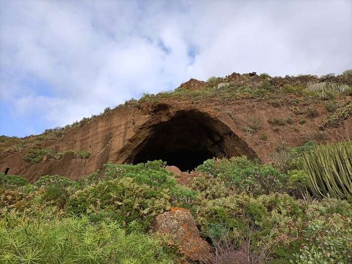 El histórico abandono de este yacimiento ha facilitado que la entrada a esta última cueva se encuentre protegida, no tanto por rocas desprendidas sino por una tupida vegetación que, cerrándola prácticamente, a punto está de imposibilitar el paso. A los cardones, verodes, matos de risco, cornicales, bejeques (Aeonium percarneum), mamitas (Allagopapus dicotomus) se une una sucesión de tuneras indias que unas junto a otras imposibilitan el paso con su maraña espinosa, dificultando mi intención de seguir bordeando la ladera. Es entonces cuando observo una decena de escalones labrados en la roca y por ellos asciendo la ladera. Al parecer se labraron para facilitar el acceso a pequeñas cuevas que hay sobre este conjunto. Me recuerdan la factura de los escalones realizados en la montaña de Cuatro Puertas para conectar las cuevas de Los Pilares con las existentes en la misma ladera a un nivel inferior y los silos colgados del abismo.