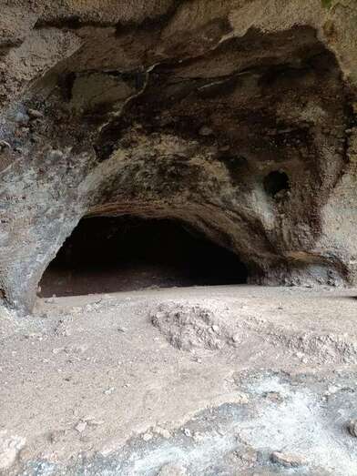 Una abertura a modo de pequeño pasillo, muy cerca de la entrada y situada a la derecha de la cueva, permite pasar de esta cueva a la siguiente. De estructura más compleja la nueva cueva tiene los mismos síntomas de total abandono. De más de diez metros de profundidad presenta un habitáculo al final de la misma y una especie de depresión en el suelo que está rellena con excrementos de paloma, cenizas volcánicas y piedras de diverso tamaño. Frente a la entrada grandes bloques de materiales escoriáceos desprendidos de la montaña alertan sobre la fragilidad de estas laderas de escorias soldadas. Podríamos pensar en una forma natural de proteger la entrada de la cueva, pero lo cierto es que, en zonas de desprendimientos más o menos recientes, debemos ser muy cautos. Las palomas bravías anidan en la mayoría de estas cuevas y, ante la escasa frecuencia de seres humanos en su interior, vuelan atropellándose, visiblemente asustadas, cuando voy accedo a cualquiera de ellas. El susto es mutuo pues en su precipitada huida dejan sus oquedades rozándome la cabeza.