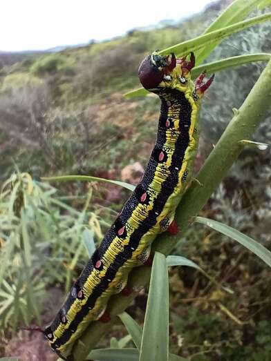 Interesante es la explosión de vida invertebrada que encuentro en las hojas de las tabaibas amargas. Cientos de orugas de bellos y llamativos colores, barreadas longitudinalmente de franjas amarillas y negras, con llamativos ocelos rojizos o púrpuras en su cuerpo y una cabeza, palpos y patas torácicas de color marrón (ver foto), delatan a una mariposa perteneciente al género de los Esfíngidos. Se trata de una subespecie endémica, la esfinge de las tabaibas (Hyles euphorbiae tithymali) que en estos últimos días del año son capaces de devorar todo vestigio foliar de las tabaibas hasta dejar estas euforbias en el puro tallo. Lo cierto es que no observo un ejemplar de tabaiba sin una buena población de orugas de esta mariposa.