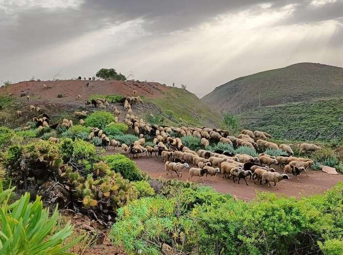 Retomando el ganado, se trata de un rebaño de unas doscientas cabezas, me confirma su pastor, con goro y refugio en Las Medianías teldenses. Los pastizales de invierno del campo de volcanes de Lomo Magullo es la zona de alimentación y pastoreo. Se trata de un joven pastor, de una esperanza.