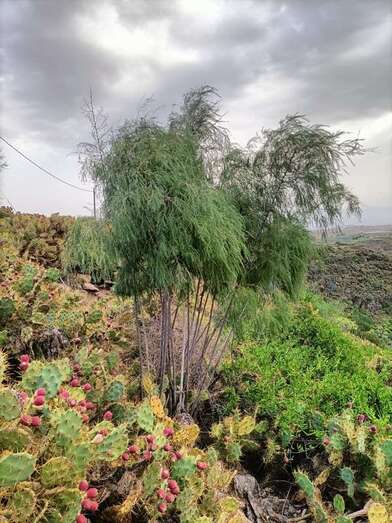 Es en esta cara donde la vegetación es más agreste, donde cardones, cornicales, azaigos de risco, verodes y tabaibas crean una vegetación arbustiva compacta que no presenta señales de alteración en mucho tiempo pues se encuentra en el mismo borde de la vertical ladera que se descuelga sobre el barranco de Silva tornándola imposible para su aprovechamiento agrícola. Se trata de un territorio donde es habitual la observación. Sobre él, de cernícalos y aguilillas, pequeña franja de la montaña donde el descenso se torna difícil y peligroso. No es de extrañar, pues, que a mi amigo Pepe Julio Cabrera Mujica le dieran la información de la presencia de alguna sabina en estos lares. No sería de extrañar si tenemos en cuenta que estamos en zonas potenciales de termófilo y se encuentran sabinas en algunos barrancos más al sur. Pero mi búsqueda, breve y nada exhaustiva, es infructuosa. También la de mis compañeros de “barrancos al golpito”, senderistas teldenses enamorados de este campo de volcanes y sus barrancos. Pero si, como me comenta mi amigo, alguien las vio recientemente, aparecerán sin duda. Tiempo al tiempo.