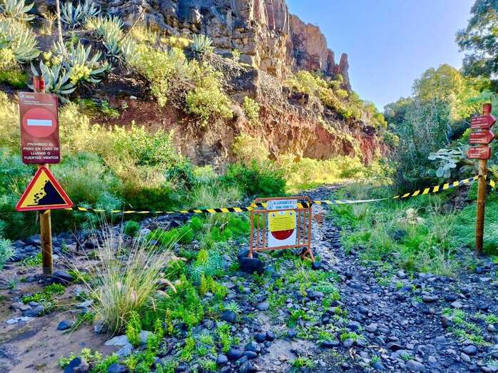 El Ayuntamiento de Telde cierra temporalmente el tramo más estrecho del Corredor Paisajístico por nuevos desprendimientos y por el reboso de las aguas pluviales debido a las lluvias de los últimos días. Se trata, en concreto, del trayecto que une el camino de El Pillar (trasera de Valle de Los Nueve) y la conocida como cueva de El Corredera, en la calle Faraday de El Ejido.