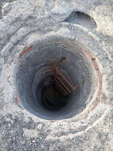 Justo a nuestros pies la ladera nos lleva a un terreno altamente degradado. En un primer momento fue preparado para ser urbanizado, con sus viales asfaltados, anchas aceras e instalaciones de alcantarillado e iluminación. Luego fue definitivamente abandonado y, a partir de ese momento y sin vigilancia alguna, tuvo diversos usos, ninguno legal: zona improvisada donde llevar a cabo, sin guía titulado por supuesto, prácticas de aprendizaje para la obtención del carnet de conducir, improvisado circuito para carreras de coches y motos infantiles, lugar escondido para desmontar coches y motos robadas... y así hasta la actualidad en que todo el espacio está convertido en una enorme escombrera, un ignorado basurero donde podemos encontrar desde basura doméstica hasta el casco de una lancha o el chasis de una moto. Es aquí donde cada boca de conexión con el alcantarillado, a falta de sus tapas protectoras -robadas para venderse como chatarra-, se convierte en peligrosa trampa (ver fotos adjuntas). Es aquí donde existe un aljibe abandonado donde, en el hipotético caso de caer en su interior es imposible salir. No tiene agua en su interior, solo escombros y basuras varias, pero la altura del mismo y las aberturas que presentan constituyen un peligro real, pues imposibilita salir de forma autónoma al no poder alcanzarse los huecos de salida, exige su inmediato sellado.