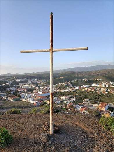 Llama la atención una cruz colocada sobre la cúspide. Una cruz sencilla, olvidada en cuanto a mantenimiento y poco atractiva, realizada con sendos tubos metálicos. Le calculo una altura de unos tres metros y el patíbulum que lo cruza medirá un metro y medio, más o menos. Muy oxidada y pintada de blanco se presenta como una cruz triste y abandonada. Sujeta a ésta, alguien amarró con un viejo alambre, otra cruz pequeña de plástico y corcho blanco, orientándola al oeste. A sus pies prosperan magarzas de costa y vinagreras.
