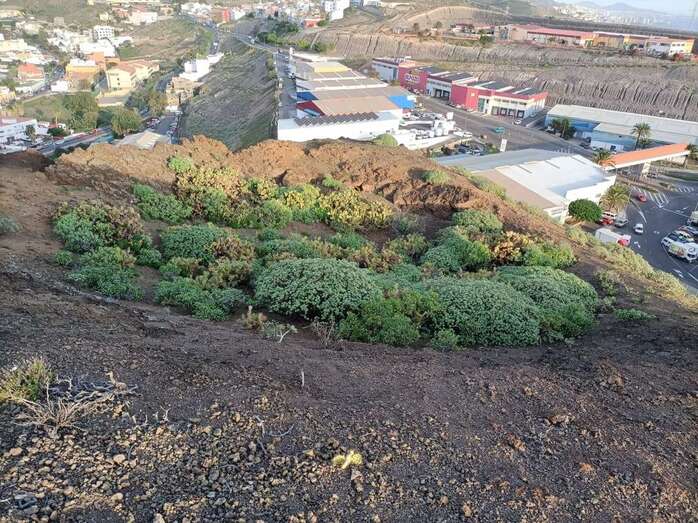 Recuperando la lectura del paisaje, poca superficie podemos observar del derrame lávico -si se trató de un, aunque pequeño, derrame lávico, de no ser así interprétenlo como un manto de escorias y cenizas-, que formó parte de esta ladera norteña pues precisamente esta colada fue socavada en profundidad y retirado sus materiales volcánicos para llevarse a cabo en su vacío, la instalación del complejo agroalimentario. Así pues, sólo observamos una decena de metros de cubierta volcánica antes de alcanzar la valla que nos protege del riesgo de caída. Es en esta zona que aún permanece donde observamos inciensos, balos, veroles, altabacas, espinos de mar, estos últimos con algunos ejemplares que presentan buen tamaño y desarrollo.