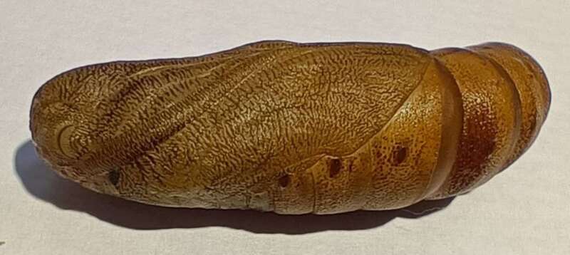 La descripción es básica: no preciso más porque si la toco se excita y como mecanismo de defensa mueve su segmento trasero que acaba en punta. Observo su cuerpo, el segmento mas largo corresponde al tórax de la futura mariposa y de hecho en su cubierta se encuentran dibujadas las nerviaciones de sus alas. Dos puntos de color marrón, un poco más oscuros que el resto del estuche a ambos lados de la pupa, se encuentran en el lugar donde deberían estar formándose los ojos de la futura mariposa. Los cinco segmentos restantes son los que se mueven a ambos lados cuando se le toca y corresponden a lo que será algun día el abdomen del lepidóptero.