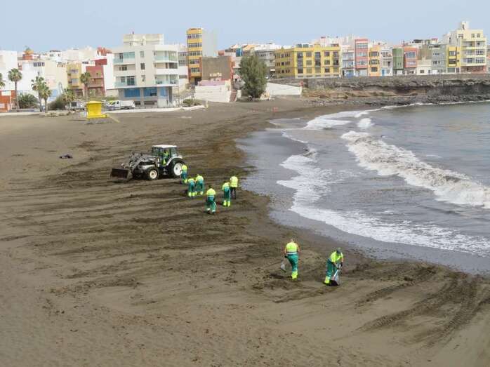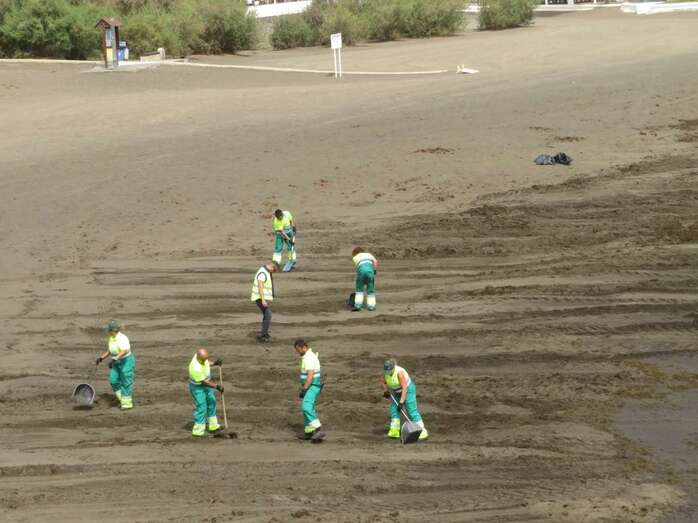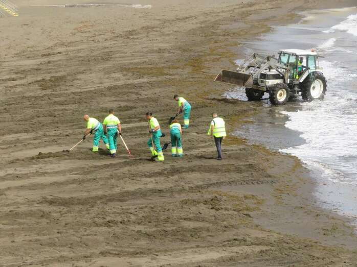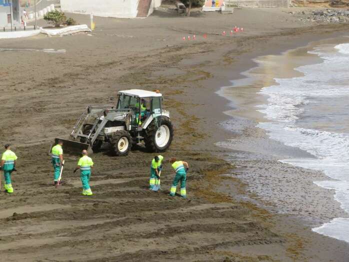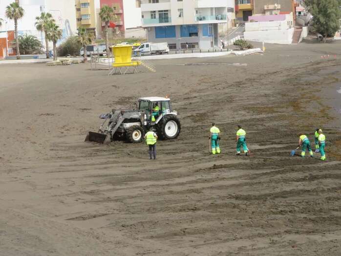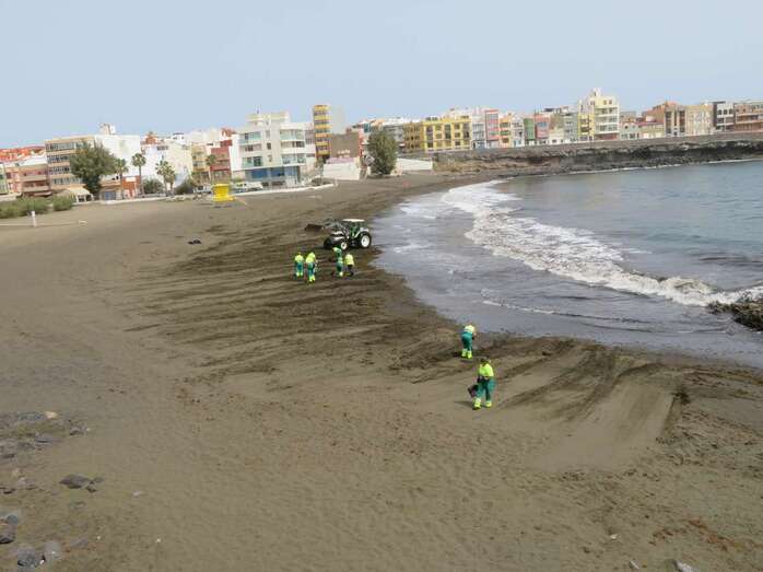 Los trabajos de limpieza del Ayuntamiento de Telde ha retirado hasta el momento más de 32 toneladas de algas de la playa de La Garita, donde estos restos vegetales se han ido acumulando por el reboso de la marea.