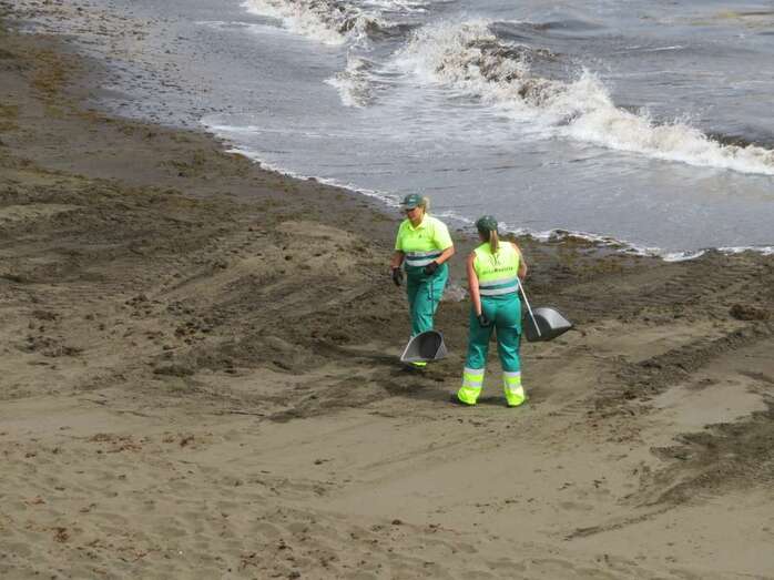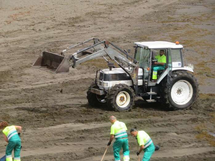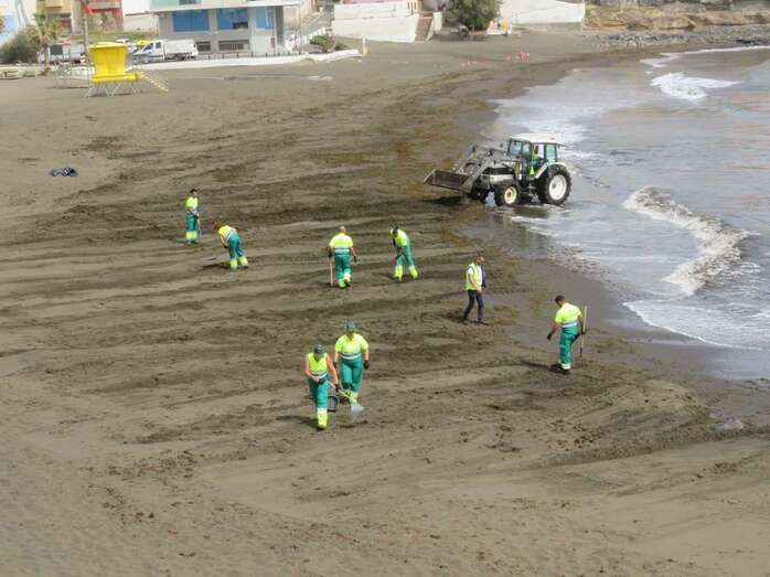 Jonay López, concejal de Playas, indicó que el volumen de seba retirada de esta cala teldense va ya por 32 toneladas, cantidad a la que habrá que sumar la que desaloje este jueves de la arena de La Garita.