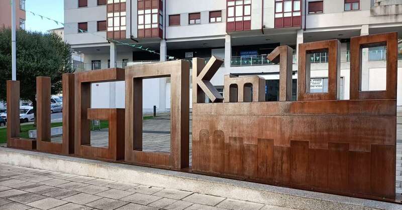 “LUGO KM 100”. Así está escrito en la plaza con llamativas letras que se elevan sobre el suelo, del tamaño de una persona y realizadas en acero cortén, un material metálico capaz de envejecer y ganar en belleza con el paso del tiempo.