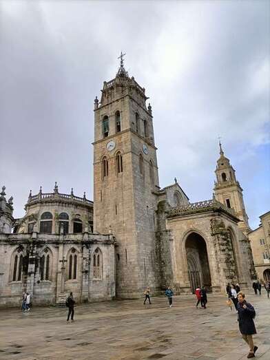 La plaza de Santa María nos dejará boquiabiertos. La presencia del mundo romano está bajo nuestros pies. Un ejemplo es la piscina romana que se encuentra bajo una ventana arqueológico a nuestra izquierda. A nuestra dereche el palacio episcopal y al frente un cruceiro como anticipo de un edificio religioso que es Patrimonio de la Humanidad, la catedral de Santa María, visita obligada a su interior y recorrido de todo su contorno para gozar de diferentes períodos arquitectónicos. La fachada neoclásica de su puerta principal, situada frente a la muralla, justo a la entrada de la puerta de Santiago, no resta belleza ni armonía al Pantocrator románico de una de sus entradas laterales.
