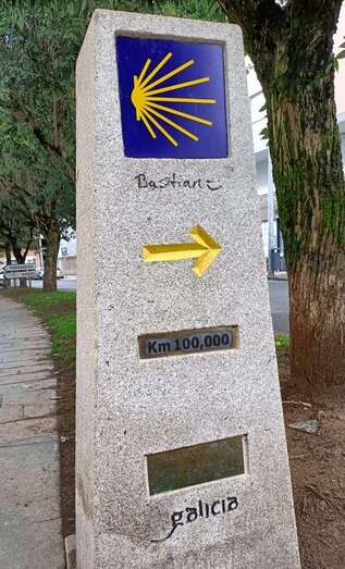 Al cruzar la ronda das Fontiñas, la mediana está ocupada por un amplio paseo arbolado que recorre toda la avenida. Paseo que circunda una buena parte de la ciudad y cuenta con bancos para el descanso de los caminantes, ubicados en ambos sentidos a lo largo de su recorrido. Aquí, justo donde nos encontramos, un mojón de piedra de granito nos ratifica la cantidad exacta de kilómetros que restan para llegar a Santiago: 100.