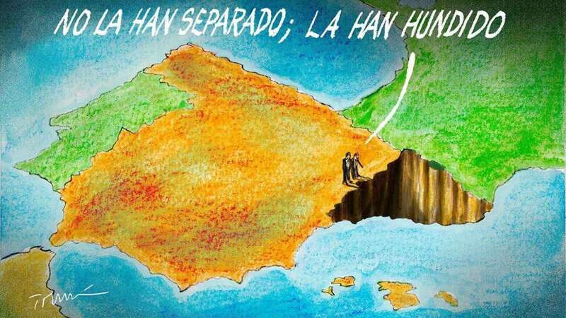 A tenor de lo sucedido esta semana de ‘difuntos’ (pero no de ‘fallecidos’, sí ‘encarcelados’), podemos entresacar que un Puigdemont más ‘loco’ que nuestro Quijote, no ha sabido ‘medir los tiempos’ y se le ha ‘escapado’ de las manos, un tema tan ‘controvertido’ como es hacer de una comunidad autónoma una especie de ‘nación’ que nunca ha sido ni será, pero que él cree que se les ha ‘robado’ esa especie de ‘derecho individual’ (como es ‘votar’ una ilegal ‘consulta electoral’) y ‘persiste’ en decir que Cataluña es ‘independiente’ y que ningún gobierno puede ‘arrebatarles’ algo que es democrático: ¿democrático el actuar al ‘margen de la ley’? ¡Vamos, Puigdemont que no nos ‘chupamos el dedo’! Y los demás ‘cesados’ siguen viendo en este personaje a un ‘César’ que ni tiene ‘imperio’ ni alguna ‘infraestructura’ y, mucho menos, un pueblo que le ‘secunde’ en sus ‘alucinaciones’. Si nos fijamos en la viñeta, parece que las dos personas que están junto al ‘agujero negro’ (supuestamente las ‘lindes catalanas’) y su núcleo totalmente ‘hundido’ dicen: “no la han separado, la han ‘hundido’…”. Se supone que son Mariano Rajoy, presidente del Gobierno de España y Xabier García Albiol, portavoz del PP en esa Cataluña ‘maltrecha’.