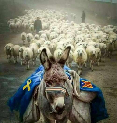 ¡Que nadie se lo tome ‘a mal’…! Es una imagen ‘virtual’ (¿‘telemática’?), en cualquier modo ‘caricaturesca’ de un ‘Puchi’ encabezando o ‘liderando’ un supuesto Govern con sus ‘consellers’, sobre un ‘torpe Puchi’ (‘adjetivado’ con respeto el calificativo de ‘Platero’) y sus ‘amigos’ (un pequeño ‘rebaño de borregos’ que le sigue…) que le ‘sigue’ a todas partes, como si no existiera otro ‘candidato’ a la presidencia de la Generalidad. ¡Basta ya de ‘mezquindades’, Carles Puigdemont…! ¡Te has quedado ‘solo, y lo sabes’! ¡Por más ‘vueltas’ que quieras dar por esos ‘picos’ de Europa! ¡Deja ya de ‘engañarte’ y ‘reírte’ del resto de los catalanes! Tu ‘actitud’ no es la correcta: ¡sé ‘valiente’!