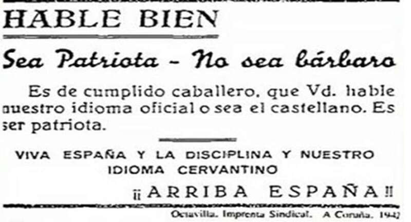 Pero, estimado lector, tales pedagogías ni nacen con los profesores Lázaro / Tusón y su equipo ni con la posterior concienciación de FUNDÉU. Véase, si no, la foto de este artículo: ya en 1942 algún organismo oficial -quizás Falange Española y de la JONS (“Imprenta Sindical”)- imprimió octavillas invitando (o imponiendo a través de los imperativos) al correcto uso de “nuestro idioma oficial o sea el castellano” por cuatro razones: patriotismo (“Sea patriota”; “es ser patriota”); civilización (“No sea bárbaro”); hidalguía (“cumplido caballero”) y adoctrinamiento (“Viva […] la disciplina”).