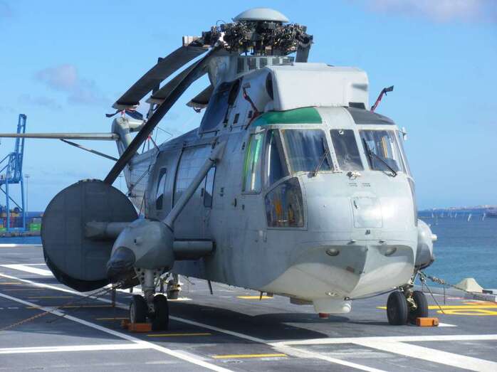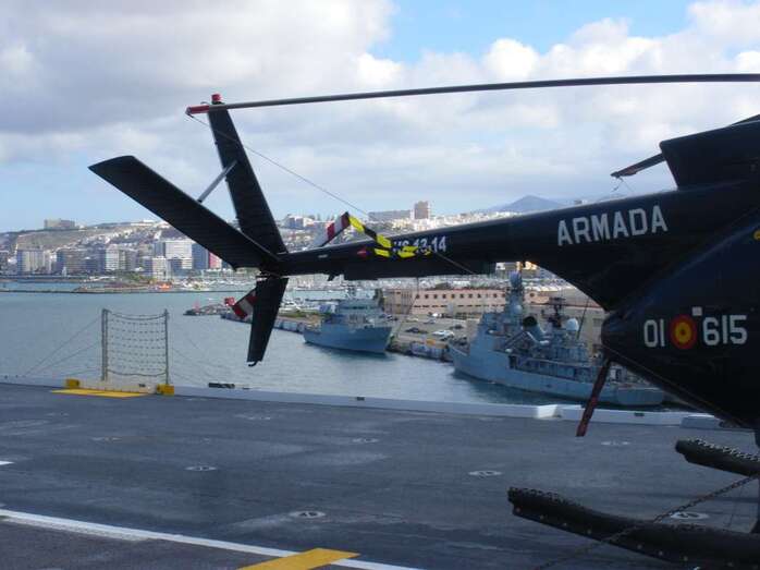 Pero no!, hogaño, el mayor navío de guerra de la Armada Española. El L61. Buque de Asalto Anfibio o de Proyección Estratégica; posee un dique inundable o sea que hace aguas. Y puede albergar hasta 4 lanchas de desembarco tipo LCM-1E. Así, estas salen navegando desde su interior hasta la costa donde dejarán las tropas, vehículos de cadenas, o de ruedas y otro material diverso relacionados todos con los negocios propios de la guerra. Su eslora y mucha manga lo adecuan para algunas operaciones aéreas ( eslora es longitud y manga por ancho ). Puede transportar en su hangar y cubierta de vuelo diferentes aeronaves sean de ala rotatoria ( helicópteros ) y de ala fija y despegue vertical ( tipo Harrier ). Por si la cosa levanta p’arriba, y aire…..