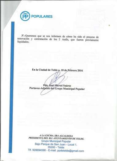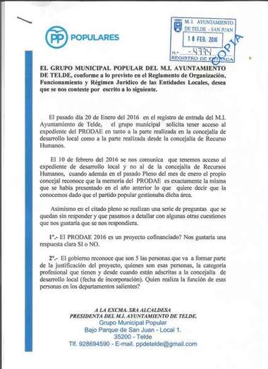 Telde.- El Partido Popular de Telde denuncia públicamente que el Gobierno de Telde le restringe el acceso al expediente completo del Prodae (Proyecto de Promoción del Desarrollo y de la Actividad Económica). Según aseguran los populares, tan solo se les permite consultar una parte del documento, la relativa a la Concejalía de Desarrollo Local, y no la elaborada desde el área de Recursos Humanos.