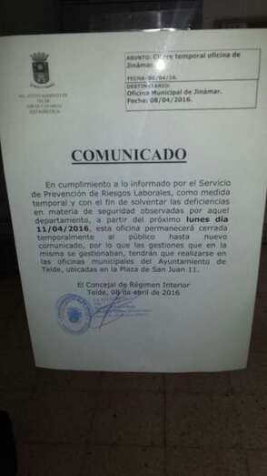 Las gestiones que se venían realizando en el mismo deberán ahora hacerse en las oficinas municipales del barrio de San Juan hasta tanto se subsanen los fallos detectados en el inmueble de Jinámar, según reza en un comunicado emitido el pasado viernes y suscrito por el concejal de Régimen Interior, Gregorio Viera, quien apela a la necesidad de atender un informe elaborado por el Servicio de Prevención de Riesgos Laborales.