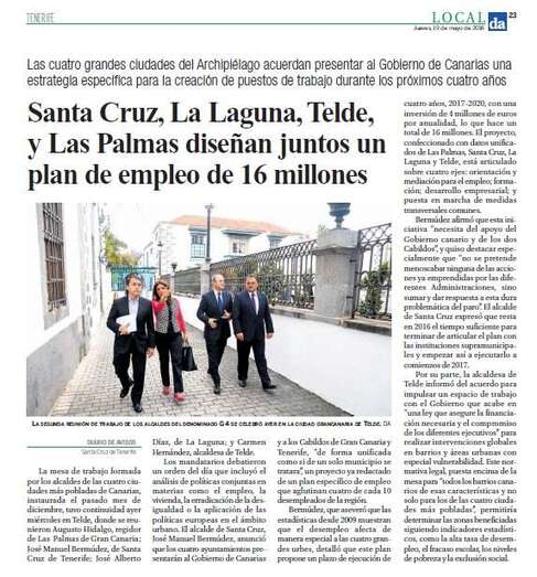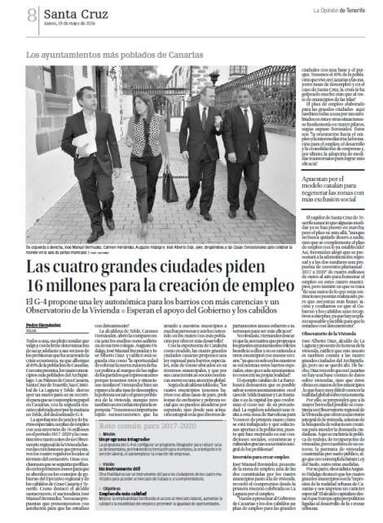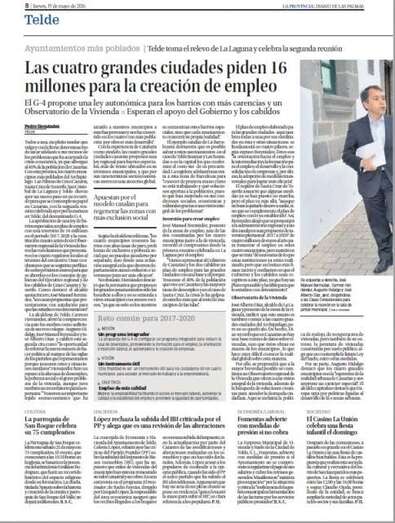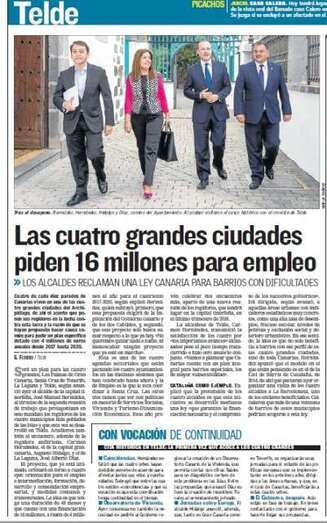 Las conclusiones de esta mesa de los cuatro primeros ediles del denominado G-4 de Canarias son ampliamente tratadas en las páginas interiores de todos los periódicos impresos, que destacan especialmente la petición al Gobierno de Canarias de un plan específico de empleo con una duración de cuatro años y una inversión de 16 millones de euros.