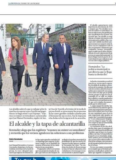 La reunión de trabajo que comenzó a las 10.00 horas en la sala de juntas de las Casas Consistoriales de San Juan, con la alcaldesa Carmen Hernández como anfitriona, abrió ayer miércoles los informativos de RTVE en Canarias, Antena3 Canarias y RTV Canarias y este jueves ocupa espacios destacados en las portada de Canarias7 y de La Opinión de Tenerife y también tiene una llamada en la parte superior del rotativo La Provincia.