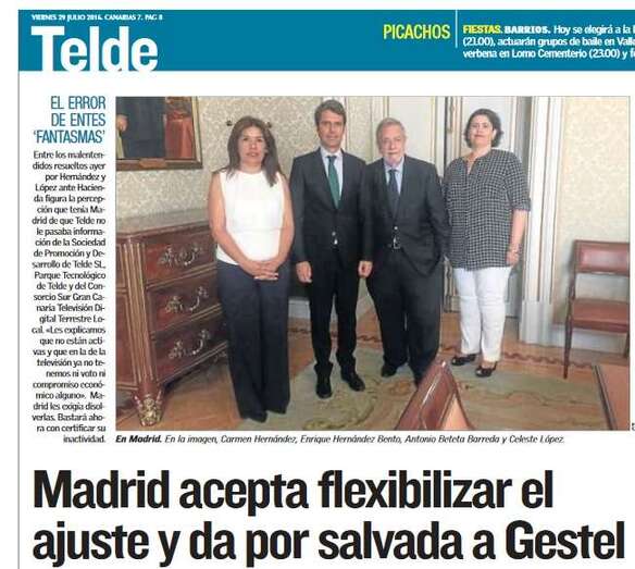 El periódico Canarias7 lleva la noticia a portada resaltando en titulares que “Madrid acepta flexibilizar el ajuste”, que completa en páginas interiores con una información a cuatro columnas con foto del encuentro de la alcaldesa Carmen Hernández y la concejala Celeste López en Madrid con el delegado del Gobierno en Canarias, Enrique Hernández Bento, y el secretario de Estado de Administraciones Públicas, Antonio Beteta.