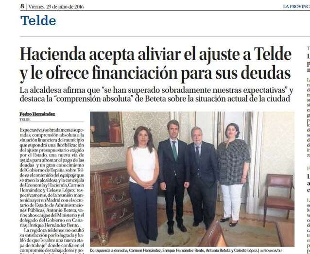 Por su parte, La Provincia-DLP trata también ampliamente la información en una de las dos páginas reservadas al municipio en la sección bajo el epígrafe Telde.  Pedro Hernández, redactor de este rotativo, titula “Hacienda acepta aliviar el ajuste a Telde y le ofrece financiación para sus deudas”. En el subtítulo se remarca que “la alcaldesa afirma que se han superado sobradamente nuestras expectativas y destaca la compresión absoluta de Beteta sobre la situación actual de la ciudad.