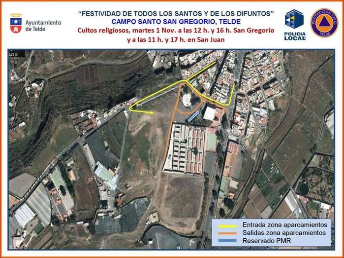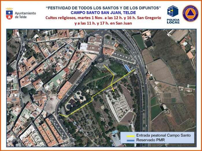 Telde.- El Ayuntamiento de Telde ha reorganizado el sentido del tráfico en algunas de las calles cercanas a los dos camposantos del municipio – el del parque urbano de San Juan y el de Lomo Cementerio– con el objetivo de mejorar el acceso a las miles de personas que se espera que acudan a visitar a sus seres queridos con motivo del Día de los Difuntos, efeméride que se celebra este martes.