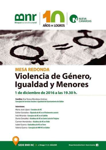 La mesa redonda estuvo coordinada por la secretaria general y concejala de Servicios Sociales e Igualdad, Ana Teresa Mendoza, y contó con la participación de María José López, senadora de NC; Esther González, diputada autonómica de NC; Inés Miranda, consejera de NC en el Cabildo de Gran Canaria; Carmen Hernández, alcaldesa de NC en Telde, Isabel Guerra, exalcaldesa de NC en Teror, y Valeria Guerra, concejala de BNR-NC en Gáldar.