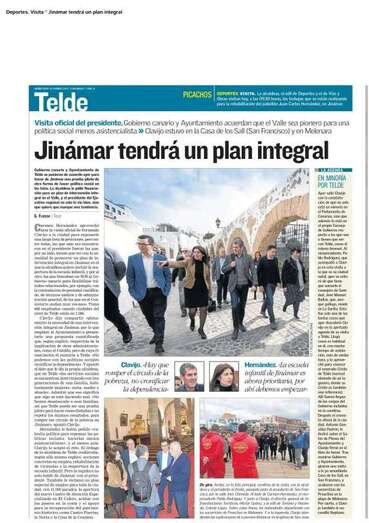 Canarias7, en crónica de Gaumet Florido ilustrada con una foto cedida por TA de la visita de Clavijo a la Basílica de Telde, titula a cinco columnas que “Jinámar tendrá un plan integral” y destaca en dos sumarios que el presidente del Gobierno señaló que “Hay que romper el círculo de la pobreza, no cronificar la dependencia” y que la alcaldesa Carmen Hernández  remarcó que “La escuela infantil de Jinámar es ahora prioritaria, por ahí debemos empezar”.