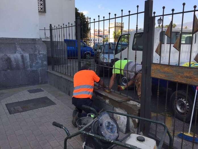 Eloy Santana, edil del área, explica que los trabajos consisten principalmente en la pintura de la carpintería metálica y el mobiliario urbano de zonas del entorno de la plaza de San Juan y pequeños arreglos de albañilería que incluye la reposición de algunas piezas de cantería que se habían desprendido.