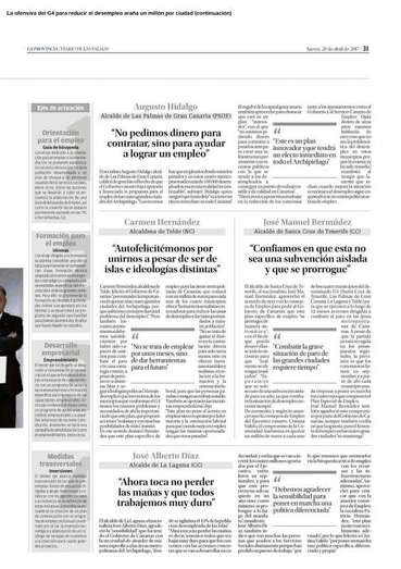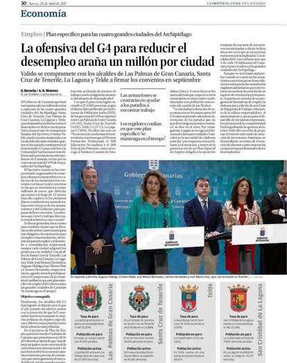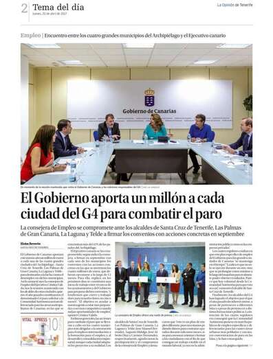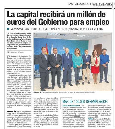 Telde.- Carmen Hernández, alcaldesa de Telde, ha destacado que plan específico de empleo para las cuatro grandes ciudades de Canarias, que contará con un millón de euros para cada uno de los cuatro municipios, ofrece “herramientas realistas e innovadoras para reducir las tasas de desempleo y dar más oportunidades a nuestra población”. El acuerdo alcanzado ayer con el Gobierno de Canarias, del que TA avanzó sus principales conclusiones, tiene este jueves una amplia repercusión mediática en la prensa regional.