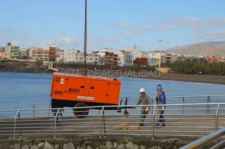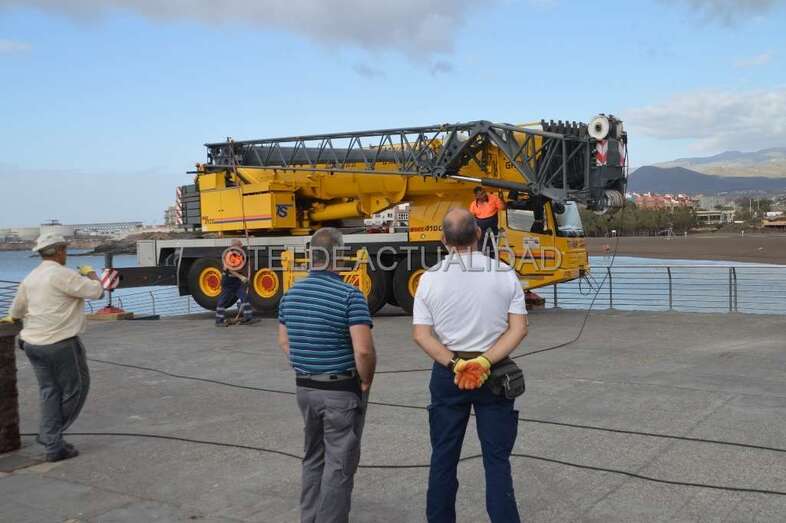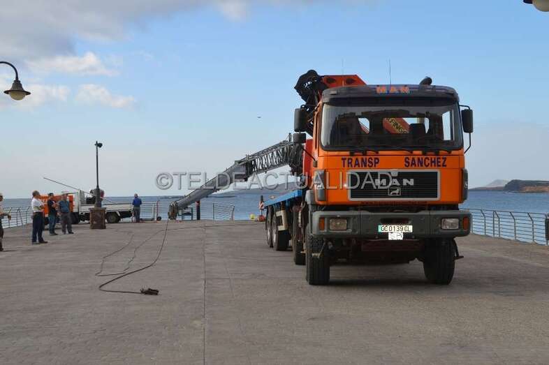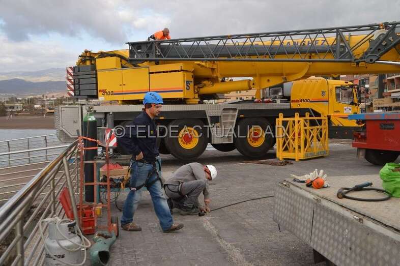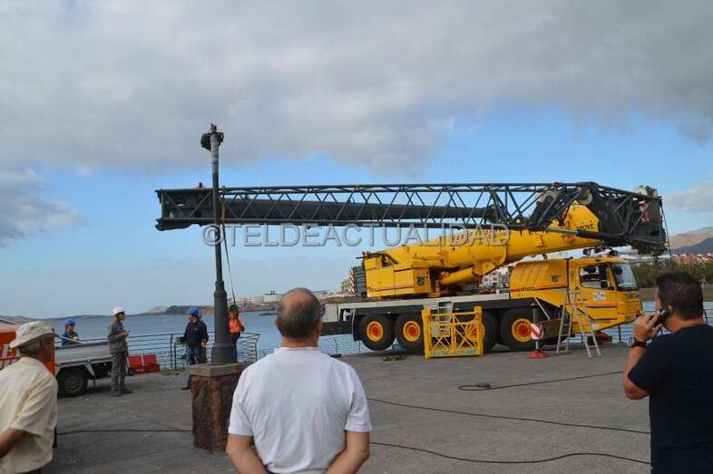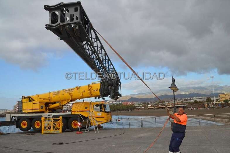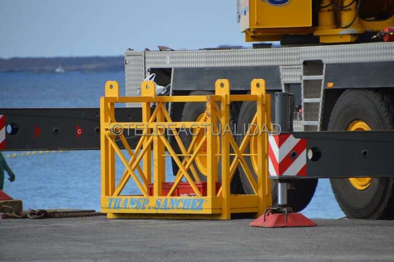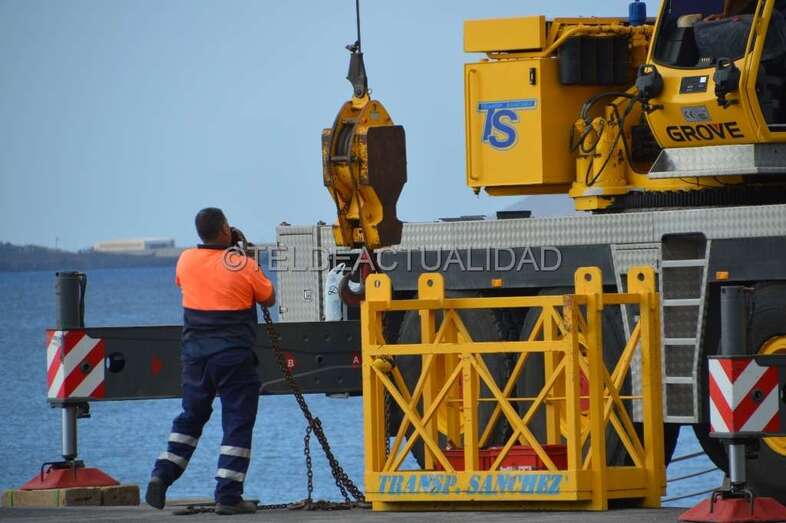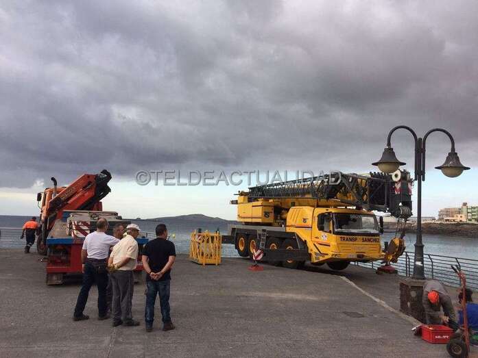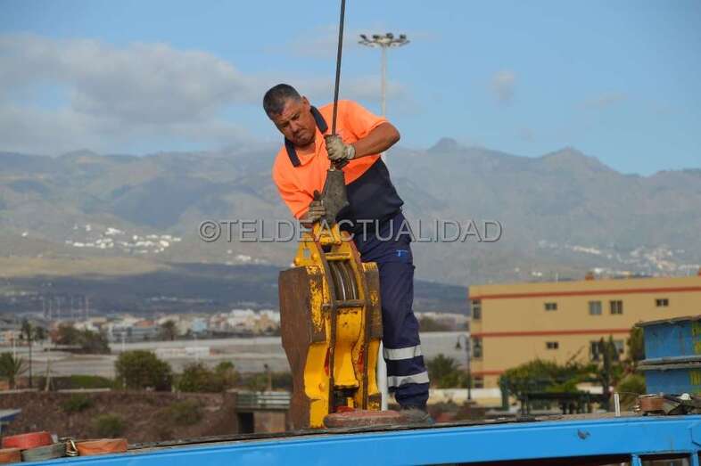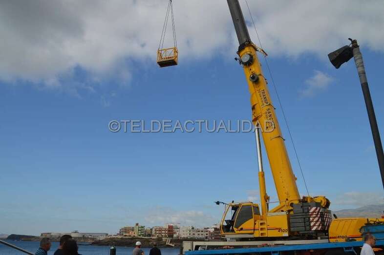 Esta enorme grúa, que llamó la atención de usuarios de la playa y de residentes en las viviendas próximas de Melenara y de la loma de Taliarte, desplazó a los operarios hasta el Puntón en una cesta, desde la que realizaron el trabajo con gran seguridad.
