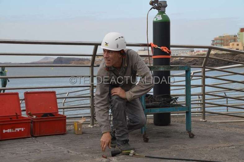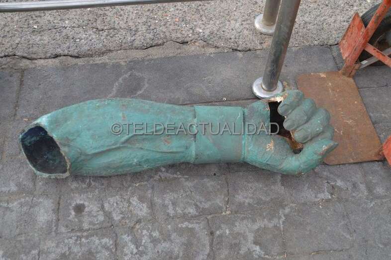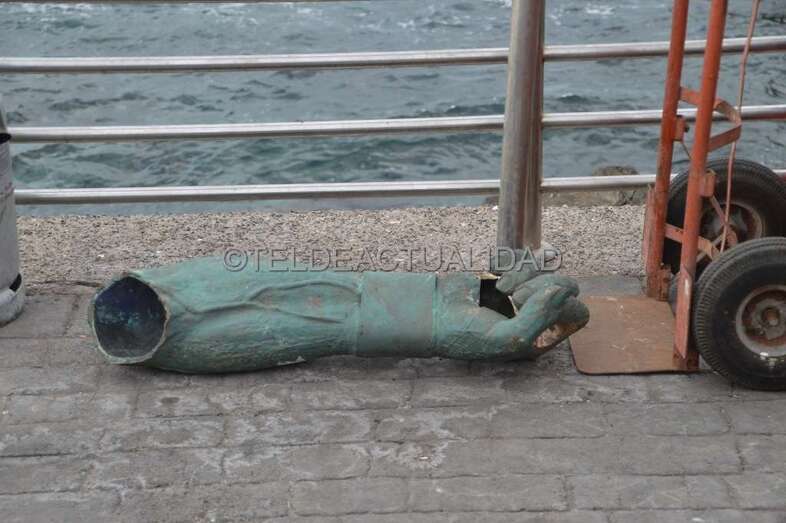 Como si se tratara de una intervención quirúrgica, los operarios del taller aruquense de fundición de Antonio Higinio hicieron las veces de expertos cirujanos y, tras efectuar un corte a la altura del omoplato, en lo que quedaba de brazo, la pieza la soldaron en el muelle al fragmento de casi un metro de longitud que se desprendió por el embate de las olas del temporal que azotó la costa de Telde el 10 de octubre de 2010.