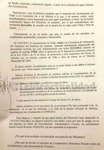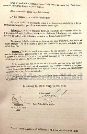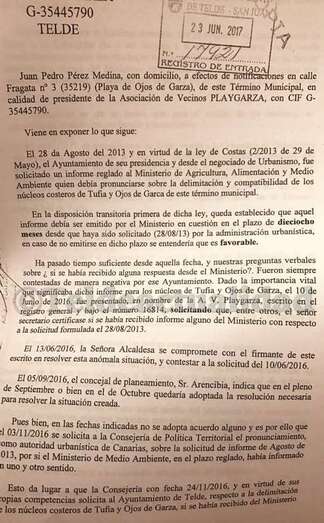 Telde.- La Asociación de Vecinos Playgarza, que representa a los residentes en la playa de Ojos de Garza, ha pedido explicaciones al Ayuntamiento por un escrito que recibió el Ministerio de Medio Ambiente el 23 de diciembre de 2014, que el colectivo entiende vital para el futuro del barrio frente a las intenciones de Costas, y que, según denuncia, se le ha estado ocultando hasta 2017, pese a sus reiteradas peticiones de información sobre ese documento.