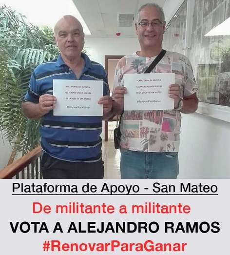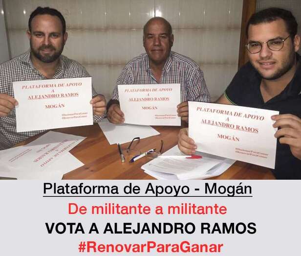 Hasta en 18 agrupaciones locales –San Bartolomé, Santa Lucía de Tirajana, San Mateo y Mogán entre ellas–, según aseveran desde la candidatura de Ramos, apoyan al teldense mediante estos colectivos, bautizados como Plataformas de Apoyo a Alejandro Ramos que defienden que la “única renovación real” del partido la representa a nivel insular el teldense, quien también sostienen que es la persona que “mejor puede encarnar los deseos de los militantes de base”.