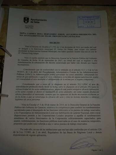 Parece, que la señora Hernández, al igual que su predecesora la señora Castellano, no lee lo que firma pues nuestra petición está basada en un Decreto de Alcaldía, 3481, firmado por ella misma el 29 de septiembre de 2017 en el que, entre otros, dispone, cito literalmente.