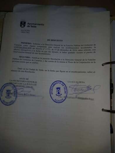 …”Primero.- Solicitar a la Dirección General de La Función Pública del Gobierno de Canarias como órgano competente para realizar los nombramientos accidentales, la convalidación del Decreto 3755, de 15 de diciembre de 2016, antes referido, con efectos retroactivos a la fecha en que fue dictado, al haber quedado vacante el puesto de Intervención General de este Ayuntamiento”…
