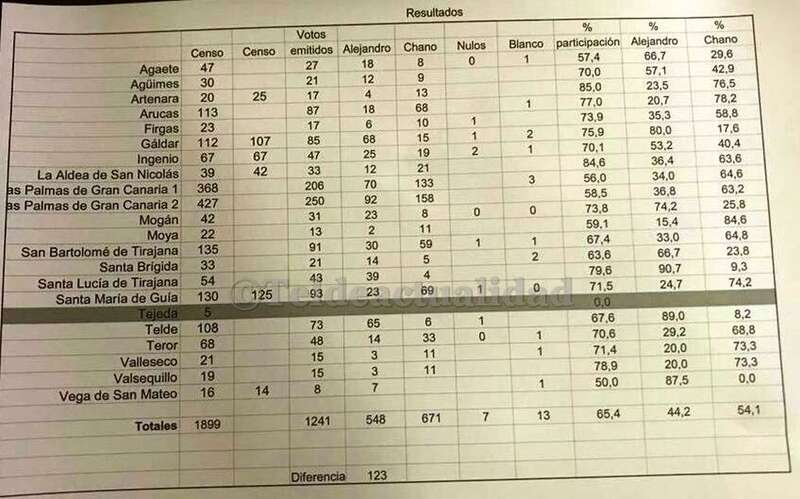 Fuera de la capital, Ramos aventajó a Franquis en seis votos, 386 frente a 380, siempre según el recuento provisional al que ha tenido acceso TELDEACTUALIDAD.