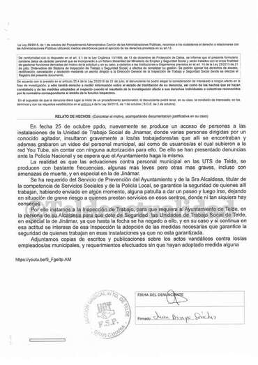 Como no puede ser menos, y ante el montaje realizado contra los trabajadores de Servicios Sociales en la Unidad de Trabajo Social de Jinámar, esperamos y exigimos a la Sra Alcaldesa que no solo espere a denuncias individuales contra quienes han insultado, vejado, acosado y otros, al personal que prestaba sus servicios atendiendo a los ciudadanos que tenían cita concertada para ese día, y que de forma salvaje irrumpieron en unos lugares de trabajo y como perfectamente se oye en el audio del video publicado, miente de forma descarada sin importarle un mínimo el trabajo que se desarrollaba y además, con falta de respeto a los usuarios que allí se encontraban para intentar resolver sus problemas.