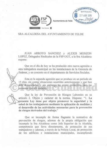 Telde.- La Federación de Servicios Públicos de UGT en el Ayuntamiento de Telde ha denunciado ante la Inspección de Trabajo la situación de inseguridad en la que desarrollan su tarea los empleados de la Unidad de Trabajo Social de Jinámar, donde el pasado miércoles fueron “insultados, vejado y acosado” por un grupo de personas que irrumpieron “salvajemente” dirigidas por un “conocido agitador”.